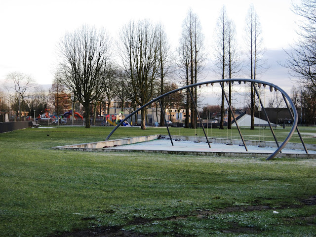 Interessant licht vandaag. Donker en zonnig tegelijk, je kan het een beetje terug zien op de foto. Het heeft net flink gehageld, daarom is de groene grond onder de schommels bedekt met een wit 'waasje'. Nog steeds geen mensen, wel één kip. Wie kan haar vinden?
